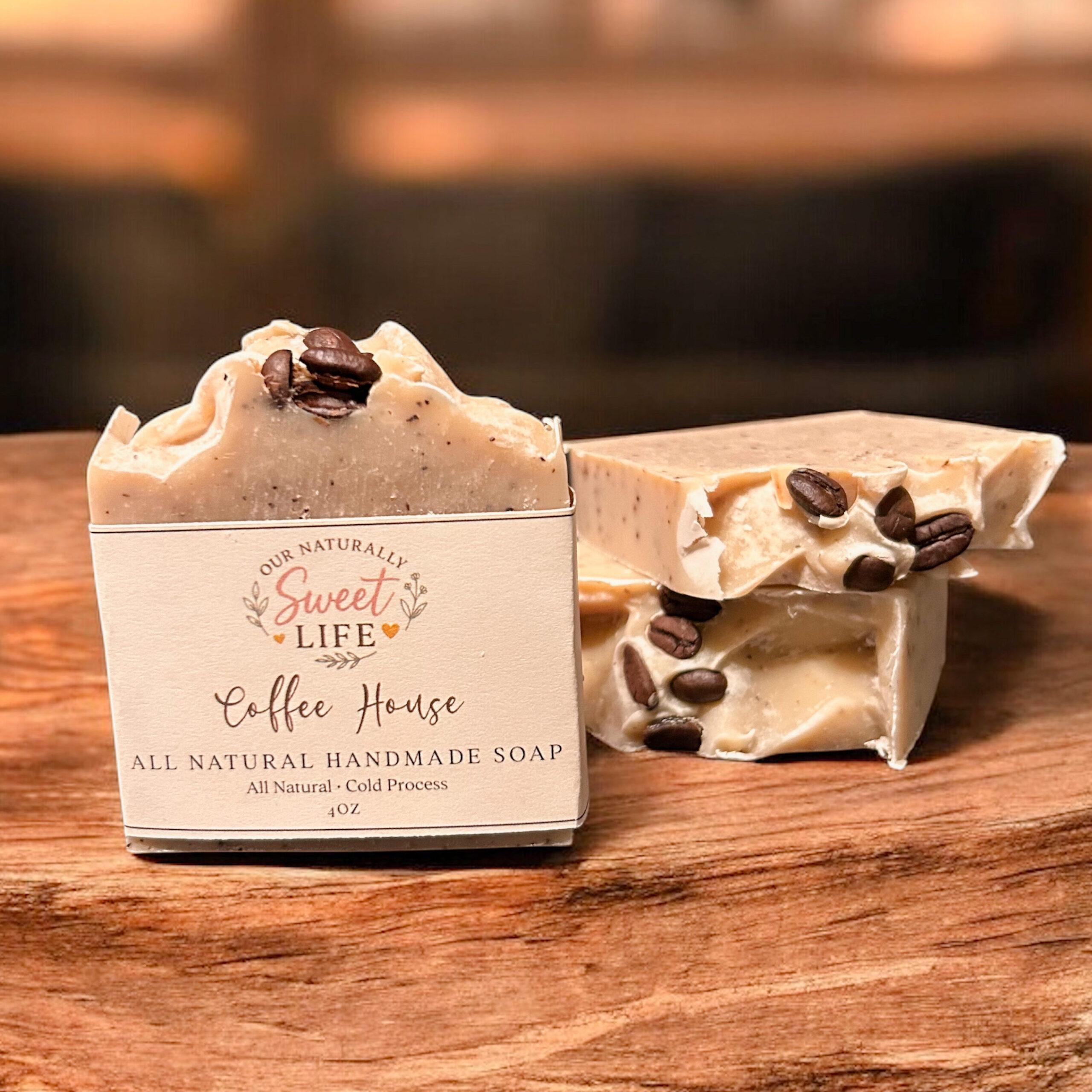 My Coffee House Soap is handcrafted in small batches using brewed coffee and nourishing plant-based oils to create a creamy, moisturizing bar with a gentle exfoliating scrub.